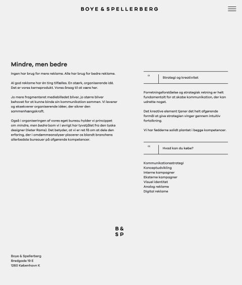 It's a simple 3 pager with information about the agency, it's competences and showcases with images and video. The website features a full backend and custom animations developed and fine tuned in collaboration with Kent, the Art Director and Partner from Boye & Spellerberg, who also designed the website.